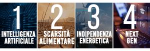- INTELLIGENZA ARTIFICIALE: è un ramo dell’informatica che influisce sempre più sulla vita quotidiana, è ormai presente in diversi settori tra cui la salute, la logistica e i trasporti.